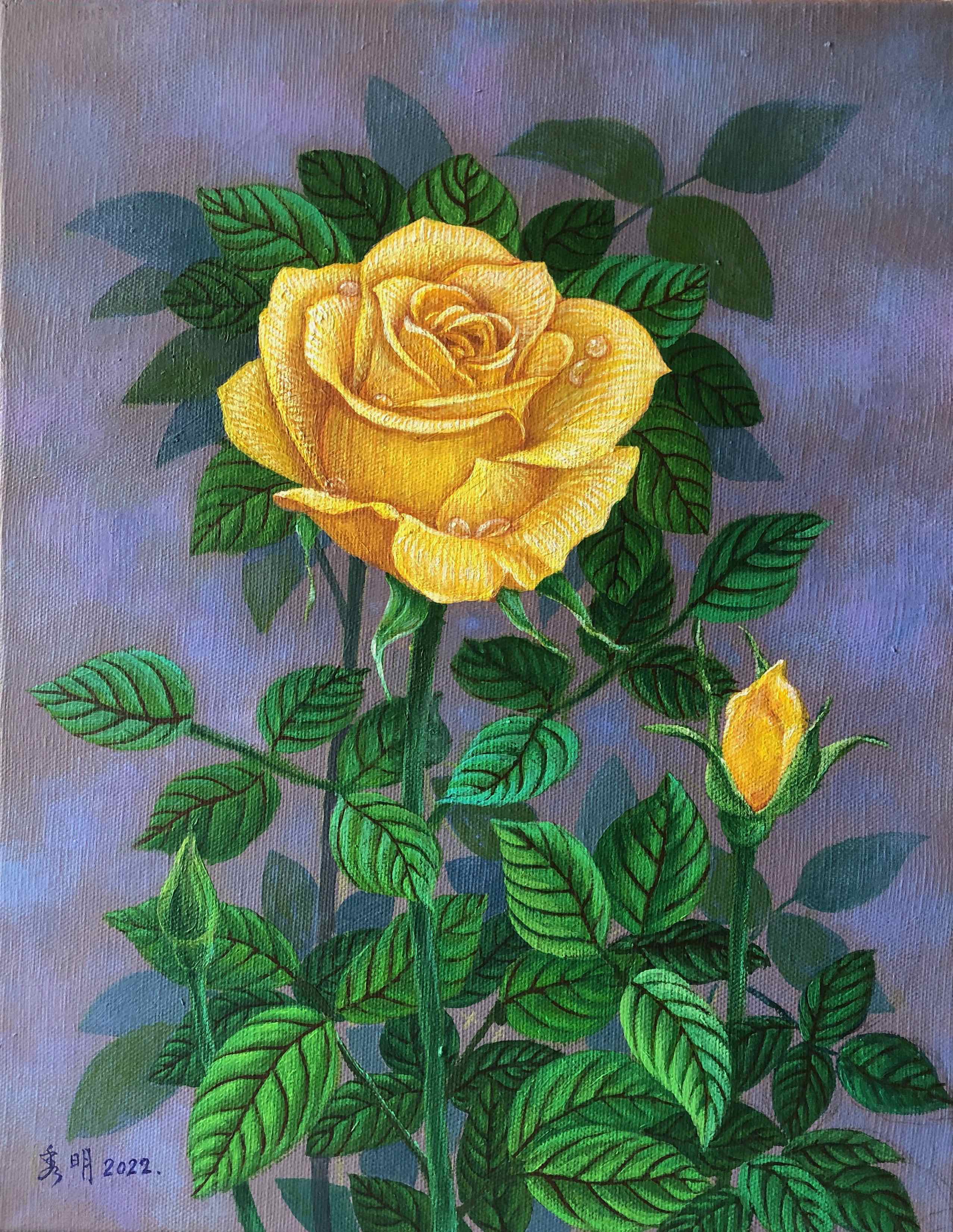 色彩美學提到金黃色的光,追溯到光明的、充滿希望的、智慧的,及至心靈的共同潛意識天堂的光輝,都是閃亮的金黃色。此作以一朵金黃色玫瑰,想讓花兒成為力量,照亮心靈。於是在預定呈現的畫面之外,以一朵春天的金黃玫瑰,綻放著獨特與美麗。只要凝聚心神欣賞,必能感受到這畫面萌發的生機,像是心中開出來的一朵花,展現內在的生命能量,又像是翩然起舞的光。