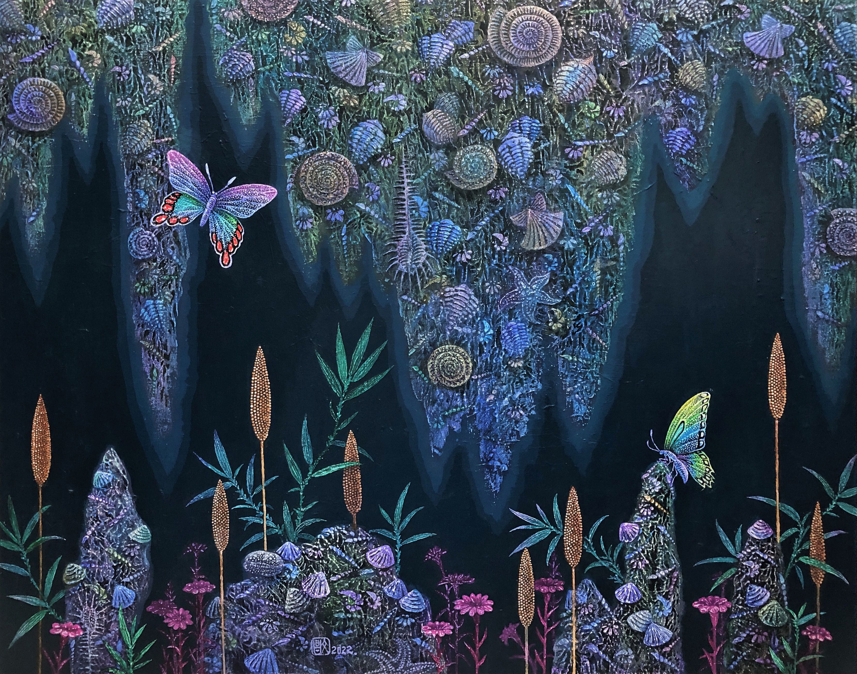 林文昌 《有彩蝶的化石風景》壓克力 72.5x91cm 2022