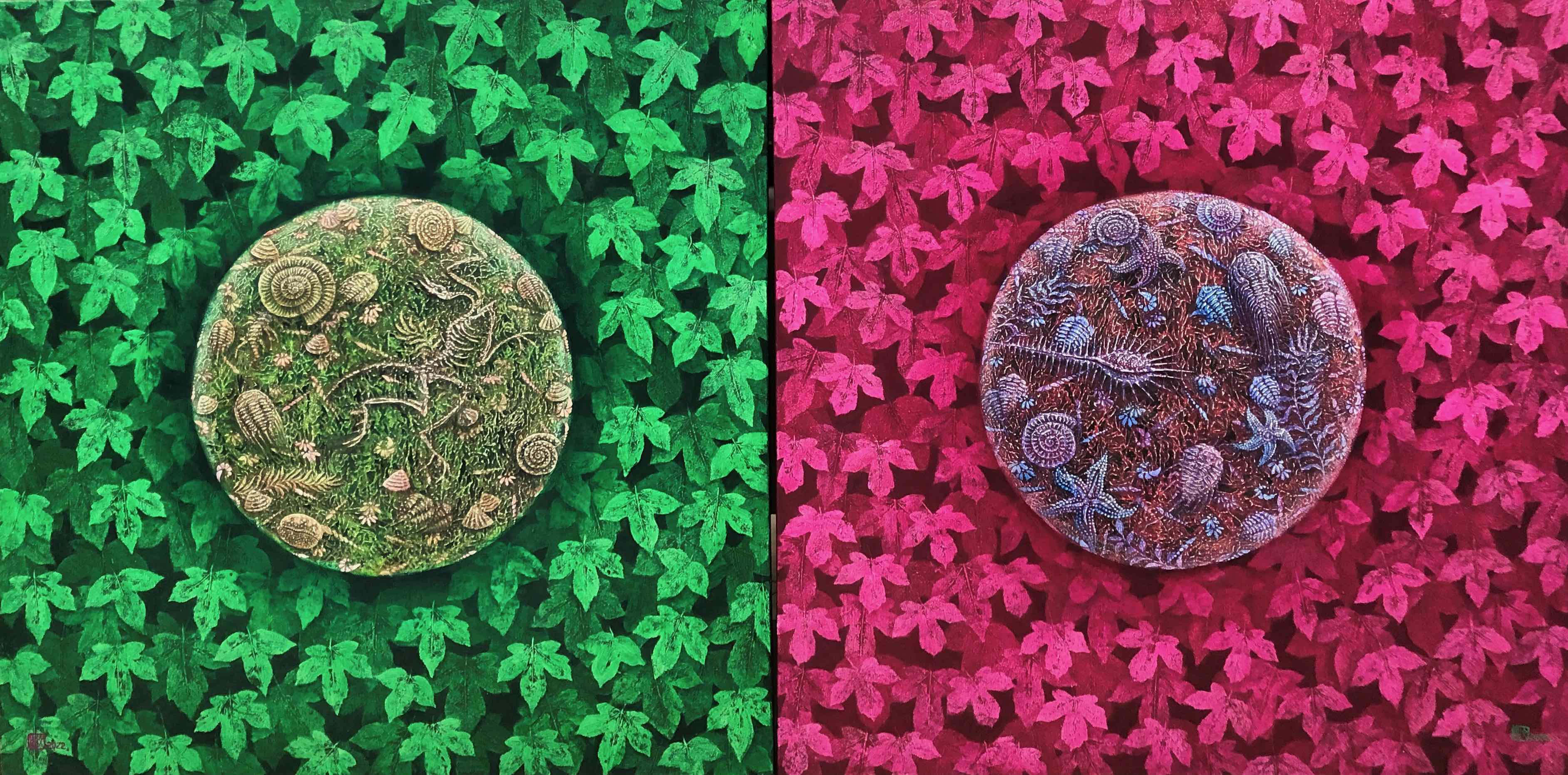 林文昌 《紅綠葉子圍繞的圓宇宙》 壓克力 99x99cmx2連幅 2022
