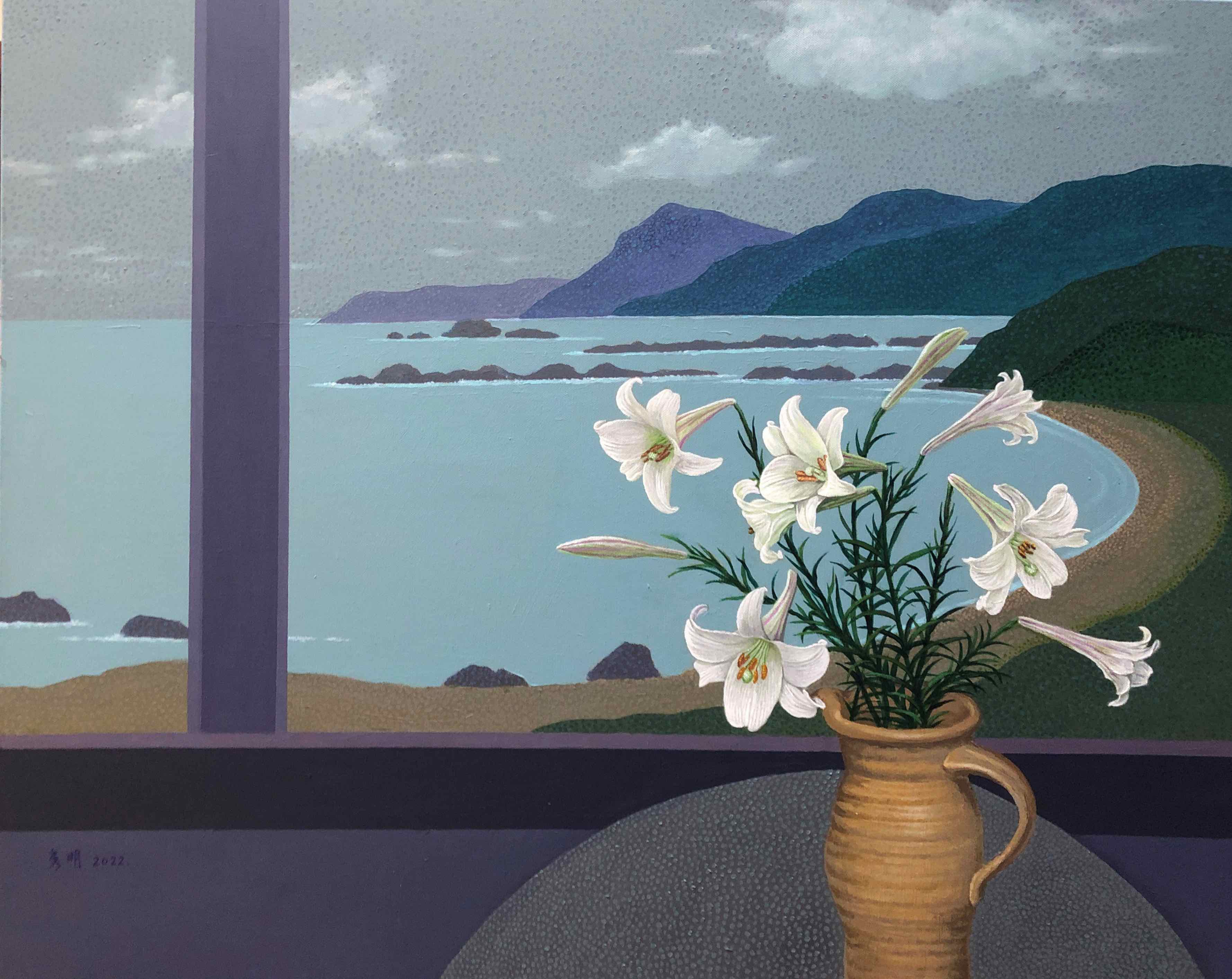 整體畫面色調溫和,以灰白為基調既不鮮豔也不灰暗,暗藏著平穩的呼吸節奏,構圖設色憑著內在的直覺與衝動去進行創作。看似窗前有百合瓶花的一幅畫,又見窗外美景一幅,將窗裡窗外兩個世界互相組織起來,成為不同的樣貌,來回應我們的視覺,而不再受限於一般感知。此作從近景遠眺鼻頭角海崖,襯著朵朵飄動的浮雲,在山與海之間,描繪台灣東北角海岸之美。特選台灣原生種細葉百合花作為主視覺,連花苞共九朵安置瓶中,取其淨白、潔白、優雅的造型與構圖,帶給人瀟灑自在、無拘無束的感覺。有趣的是,圓桌與陶瓶還有一些未進入畫面,代表此情此景是由我們現實世界所延伸的。想像:自己坐在真實的桌子前方,隨著桌面與陶瓶進入畫中,細細品味精描的百合花,及其特有的馨香之氣,以一種超越的角度靜觀畫裡的景緻,享受不受時空限制的心靈空間。